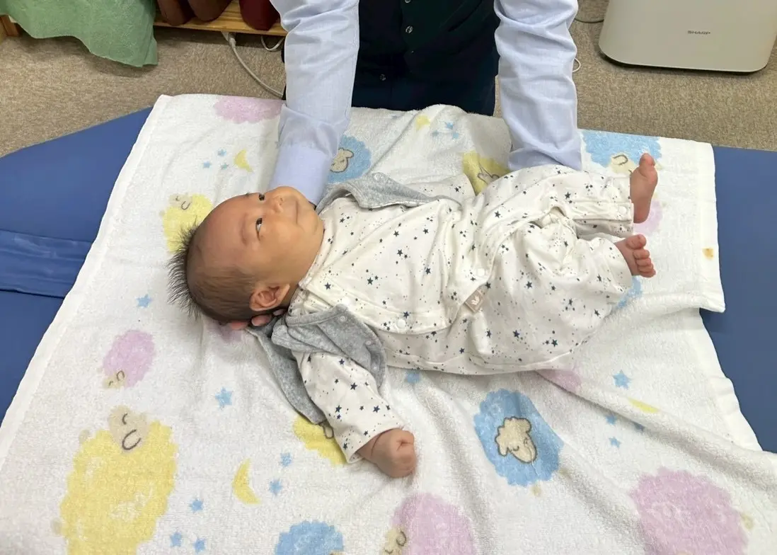 次に体の状態を検査していきます。頭の形や向き癖の程度はもちろん、首の動き、背骨の歪み、骨盤のずれ、股関節の可動域、全身の筋肉の緊張状態などを総合的にチェックします。赤ちゃんの体は正直で、わずかな歪みもすぐに見つけることができます。